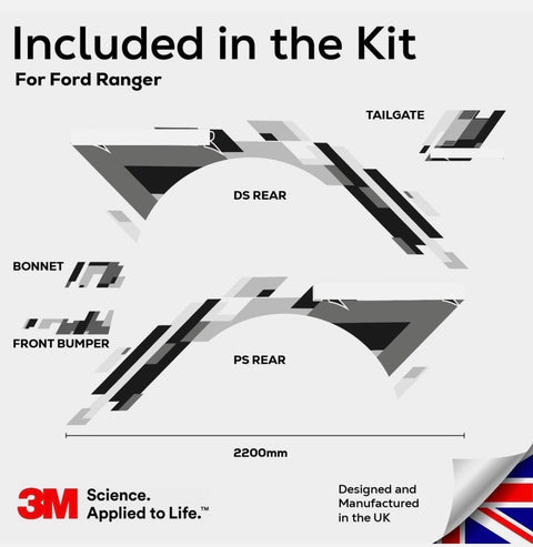 Kit complet d'autocollants camouflage géométrique pour Ford Ranger Raptor (2022-présent), fabriqué en vinyle 3M. Finition satinée.